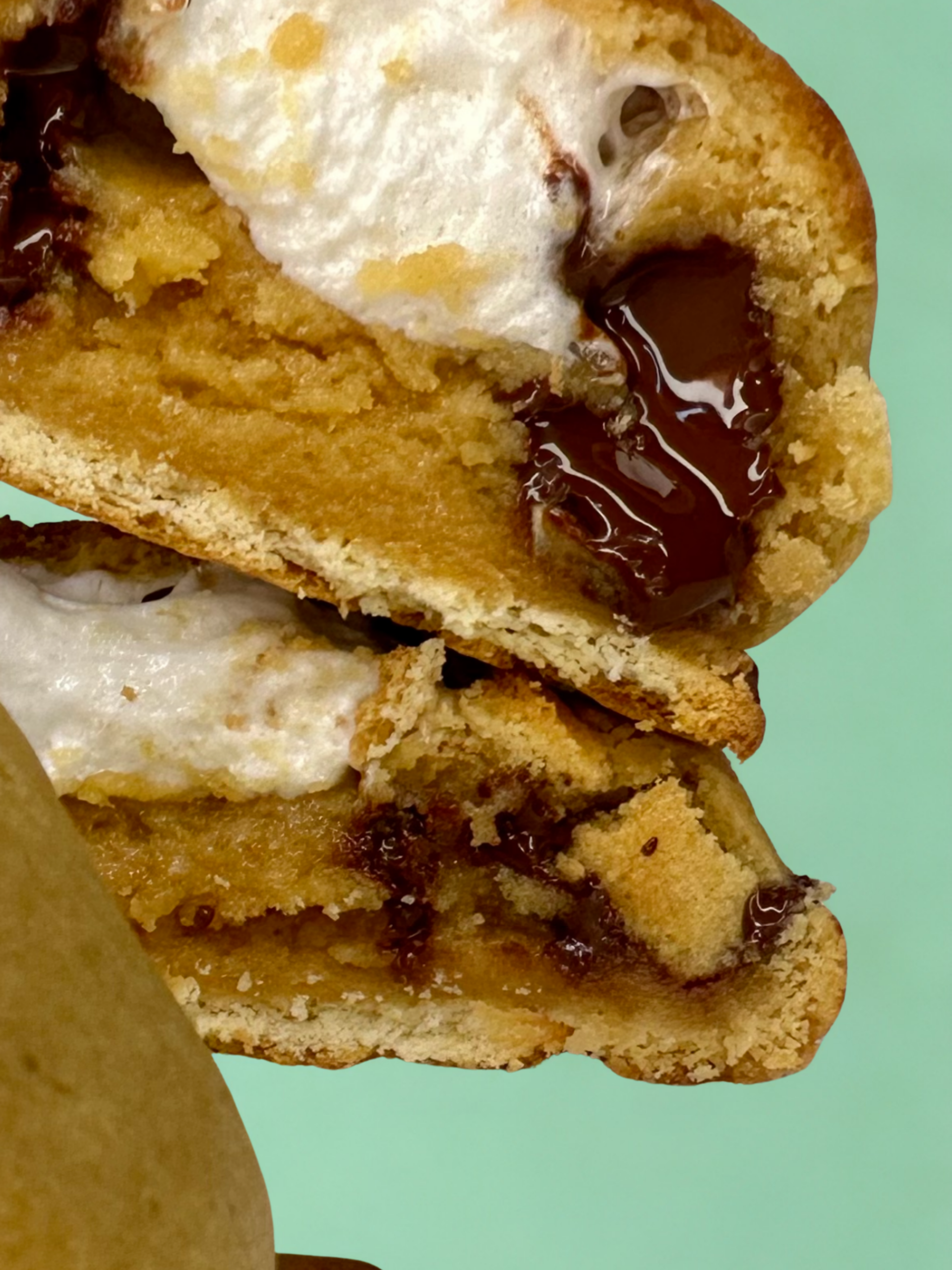 Une pâte à cookie vanillée aux pépites de chocolat, un coeur chamallow, posée sur un biscuit craquant.